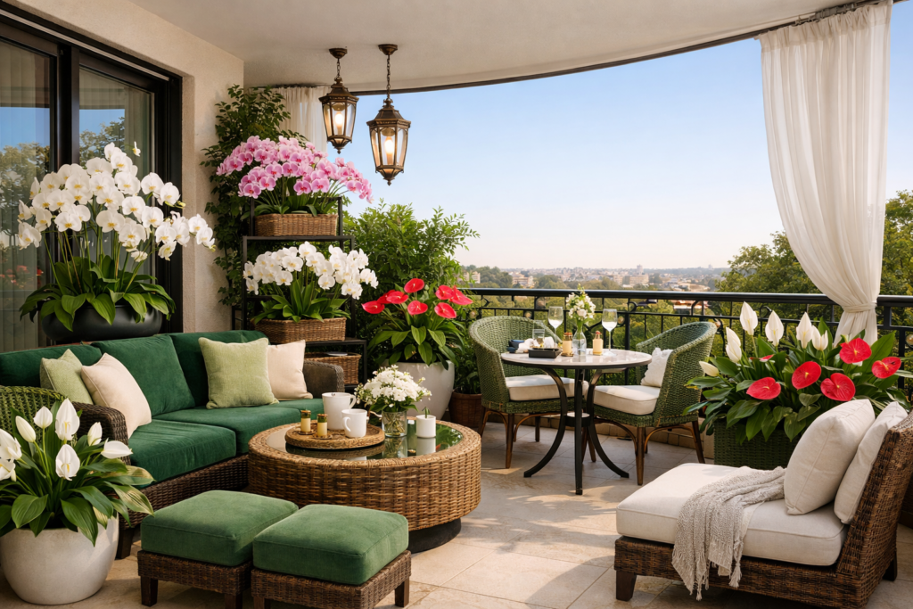 For a refined green balcony, use elegant plants like Orchids, Peace Lily, and Anthurium.