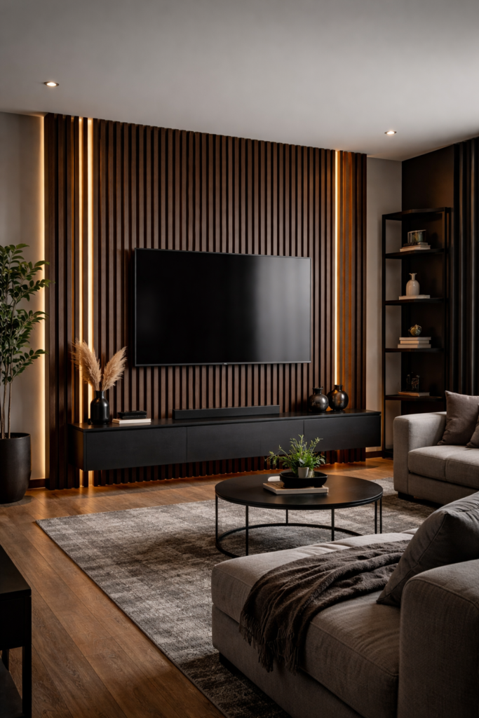 A Rustic Slat Wall is one of the hottest trends in modern decor. Vertical wooden slats instantly add depth, texture, and warmth, giving your TV wall a luxurious look.