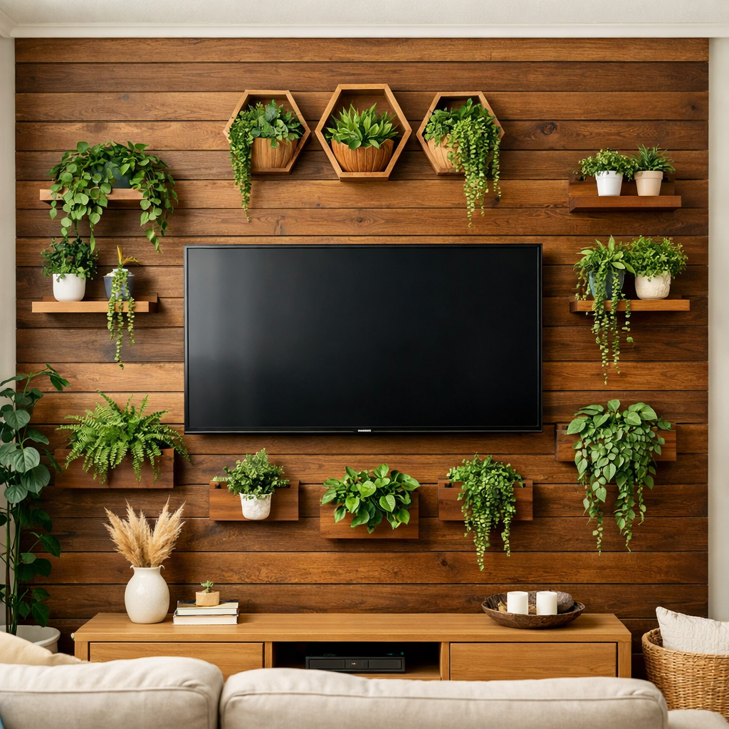 If you love natural aesthetics, adding greenery is a game-changer. Using Wall-mounted Plant Ideas like floating shelves with trailing vines makes your TV wall feel alive and relaxing.
