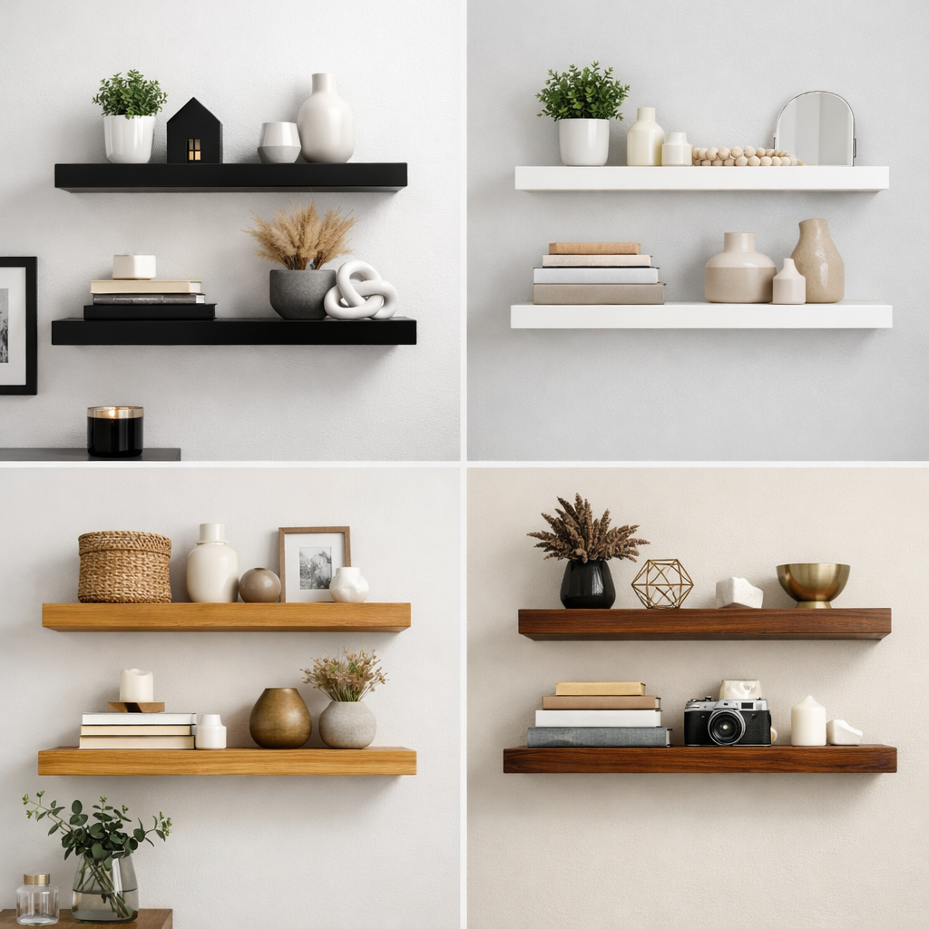 If you want a clean modern vibe, use sleek black or white shelves. If you want warmth, go with oak or walnut.