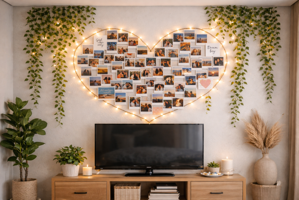A popular trend is a Photo Wall Collage Bedroom Heart, but it also works beautifully above a TV wall if done neatly. You can even combine fairy lights and vines for that dreamy vibe.