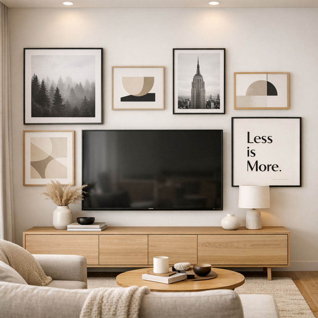 Use a mix of framed art, abstract prints, minimalist photography, and neutral textures. This is perfect if you love Interior Decor Aesthetic styling.