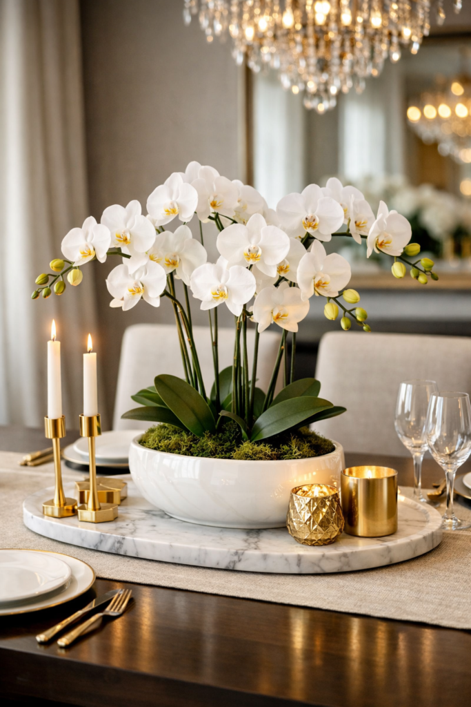 Floral arrangements elevate any dining table. A centerpiece with white orchids instantly creates an Elegant Dining Room With Orchids aesthetic.
