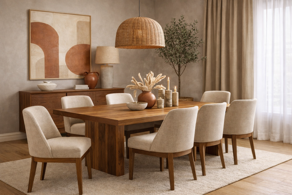 A Warm Neutral Dining Room is all about calm tones and layered textures.