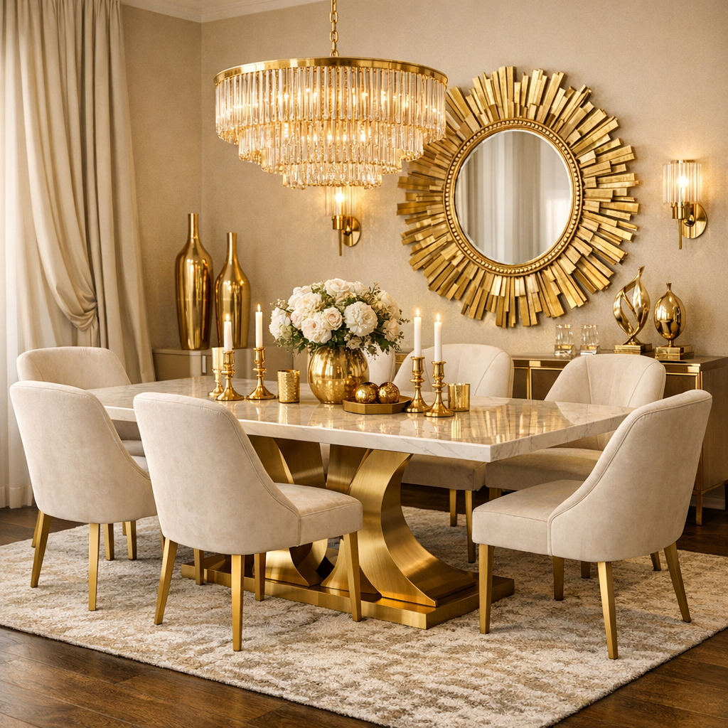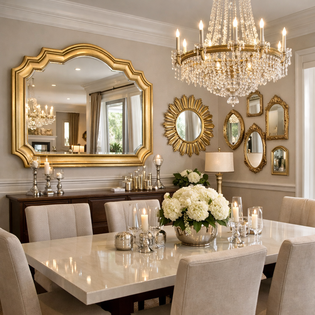 A glam gold wall mirror enhances the elegance of Dining Room Decor Modern Classy spaces.