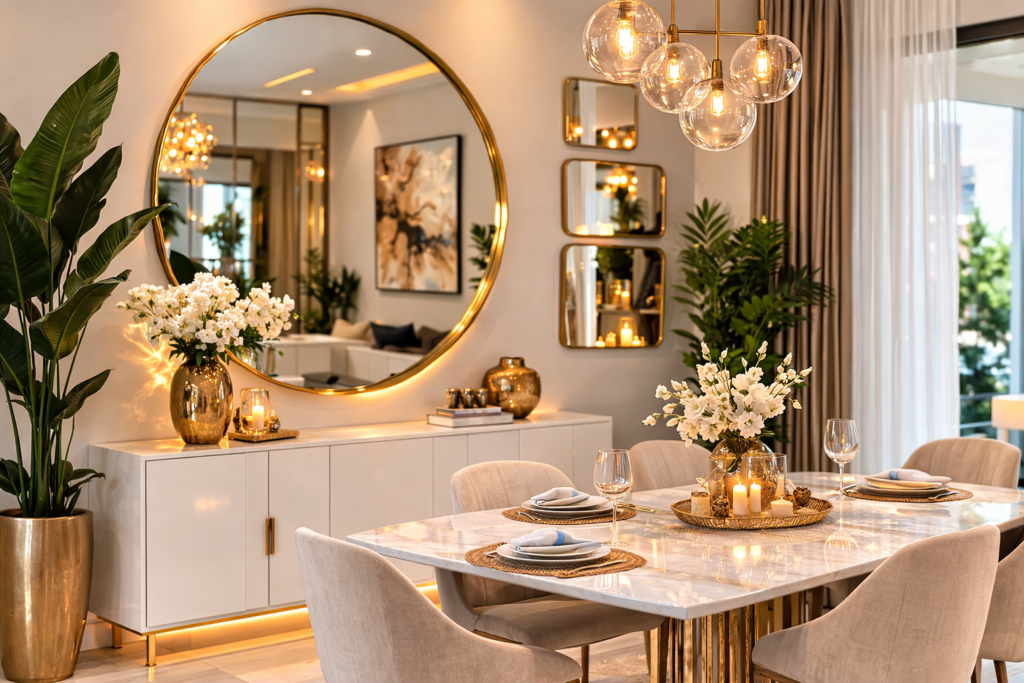 Mirrors reflect light and help create the illusion of a bigger Living Dining Room Design, especially in open layouts.