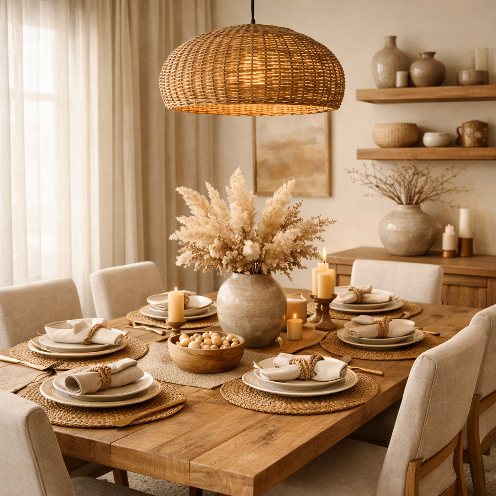Decor pieces like linen curtains, woven placemats, and wood accents help build a Natural Organic Dining Room style.