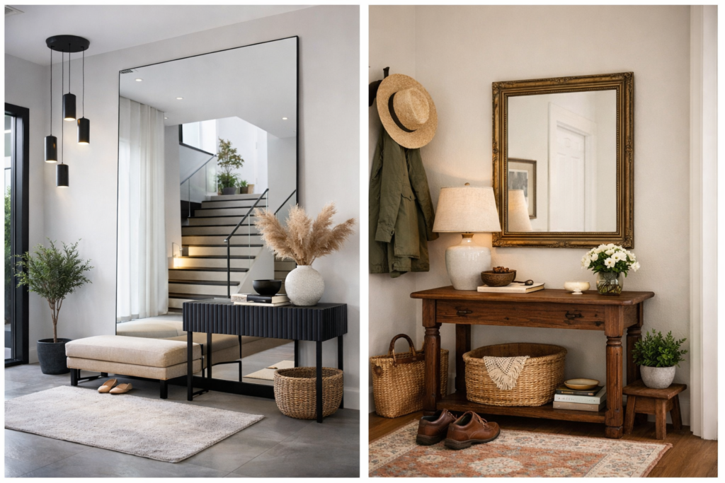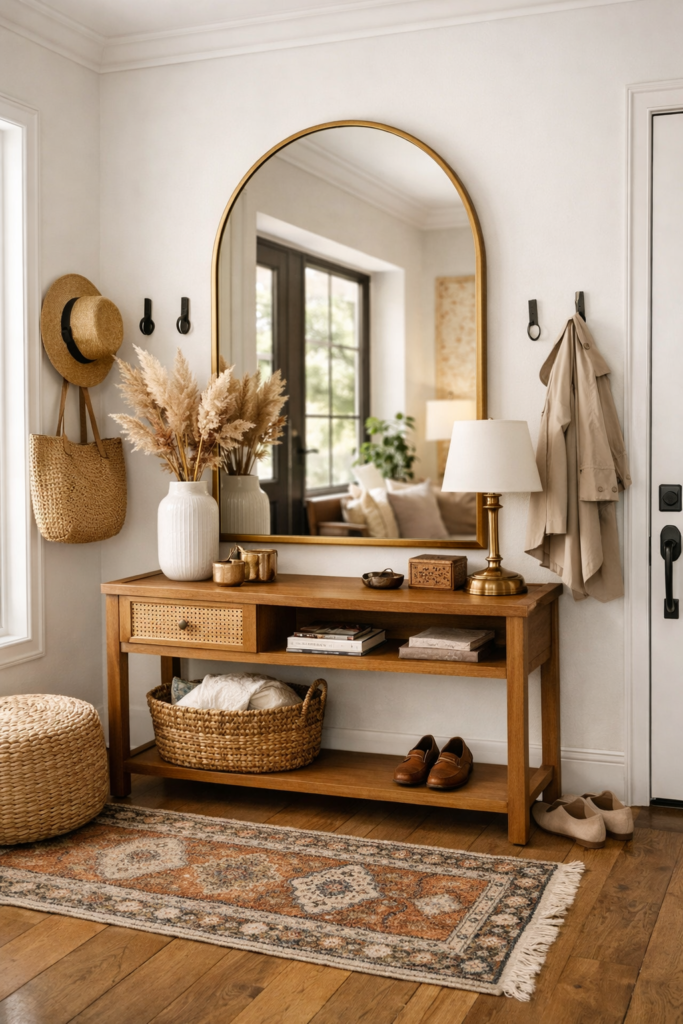 An Entry Wall With Mirror is one of the most effective ways to elevate a foyer. Mirrors visually expand space, bounce natural light, and create symmetry. Styles range from arched brass frames inspired by Ethnic Home Decor to sleek wood-framed designs perfect for Entryway Inspo Modern lovers.