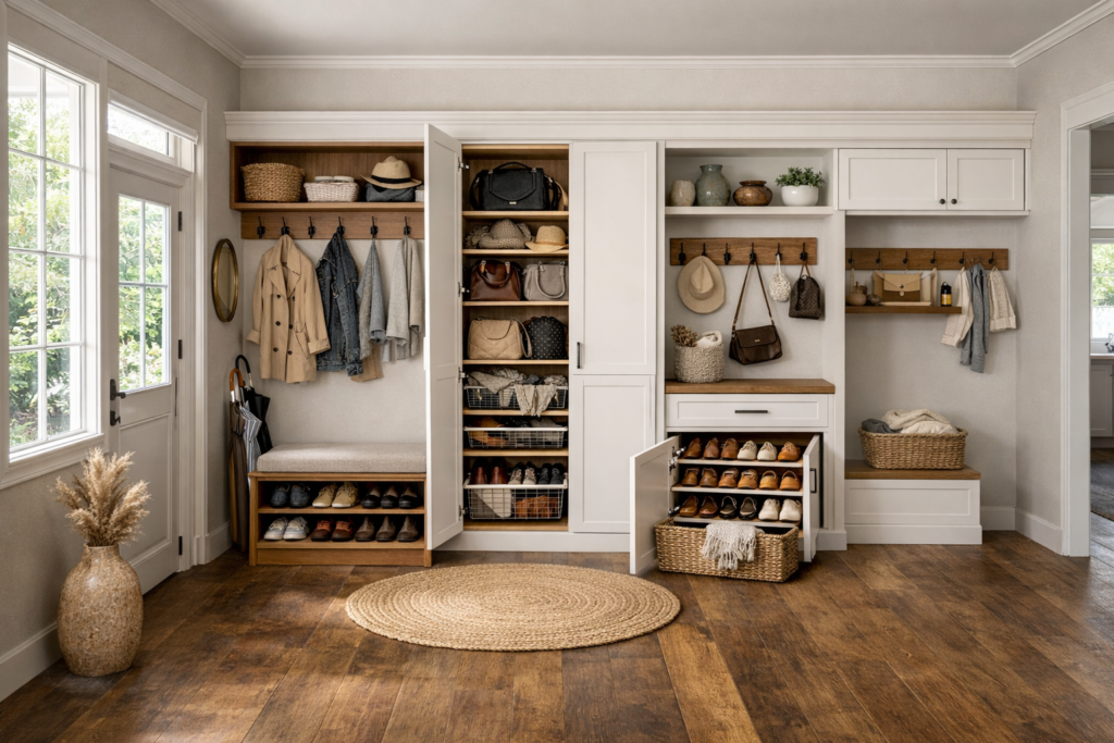 In larger homes, consider Front Entry Way Storage Ideas or Home Storage Ideas Space Saving systems that keep shoes, bags, and umbrellas out of sight.