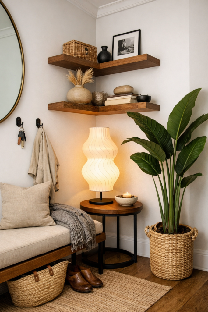 Don’t ignore corners. A smart Corner Wall Design can include floating shelves, a sculptural lamp, or a tall plant. This works especially well for Landing Entryway Ideas or awkward transitional zones.