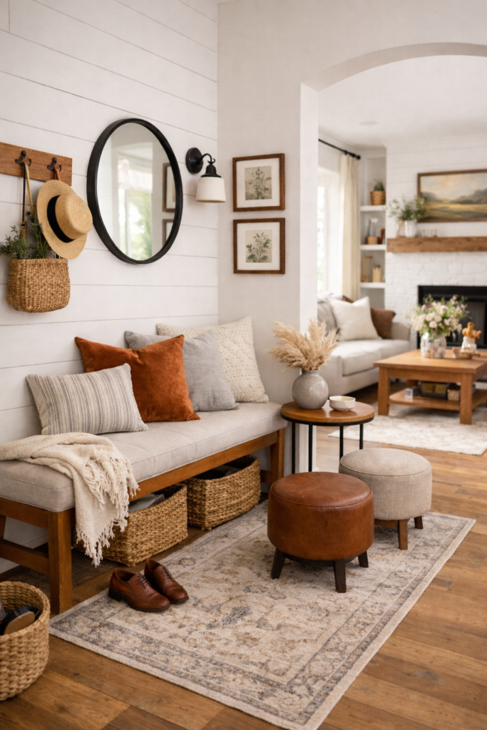 Adding seating transforms functionality. From Living Room Bench Ideas near the entrance to compact stools, seating supports comfort and adds charm. These also work beautifully for Room Entryway Ideas and Living Room Entrance layouts.