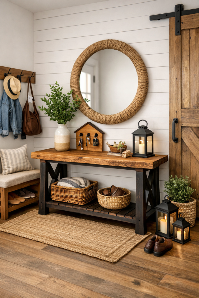 A slim console table anchors your entry visually and functionally. Focus on Entryway Table Decor that balances beauty and utility: ceramic bowls, books, plants, or a table lamp. Thoughtful Console Table Decorating keeps surfaces styled yet usable.