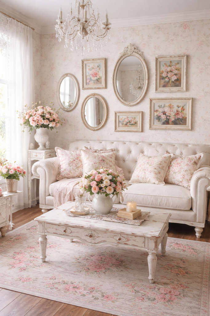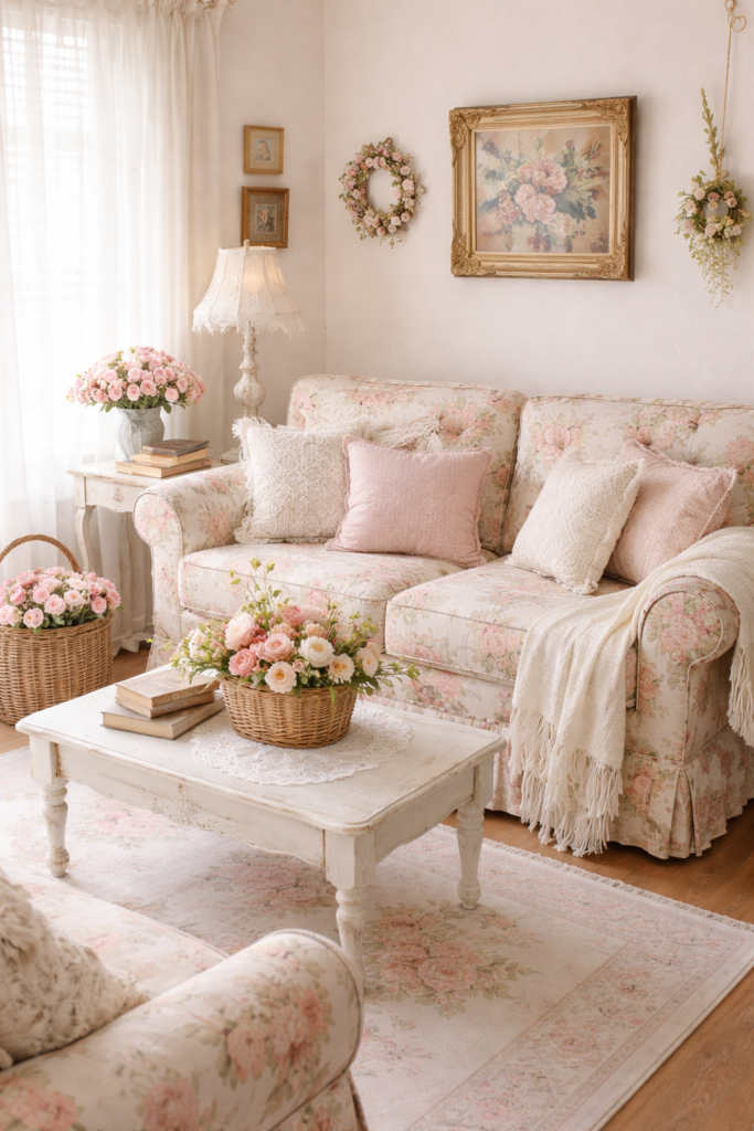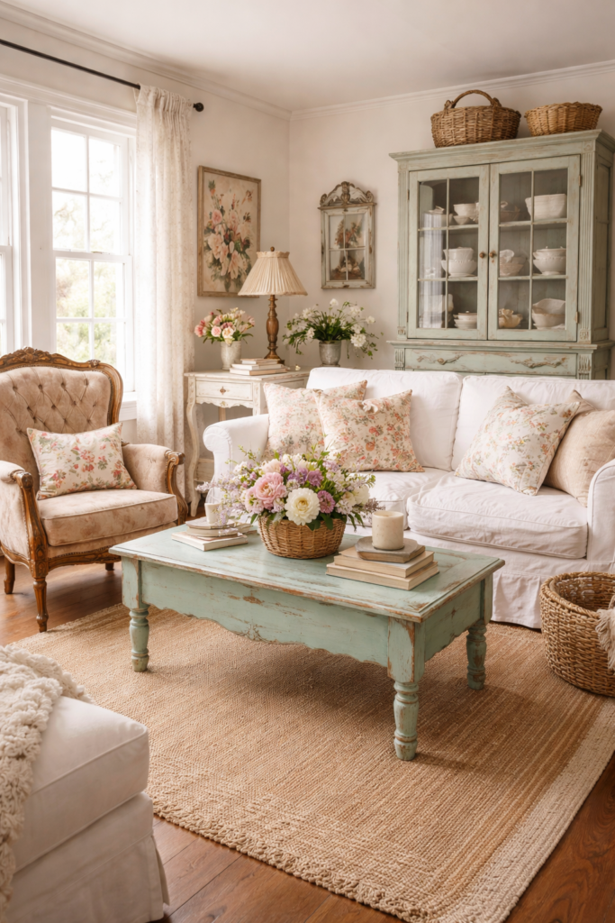 A shabby chic living room with flowers—real or faux—adds freshness and reinforces the vintage romantic decor aesthetic without overwhelming the space.
