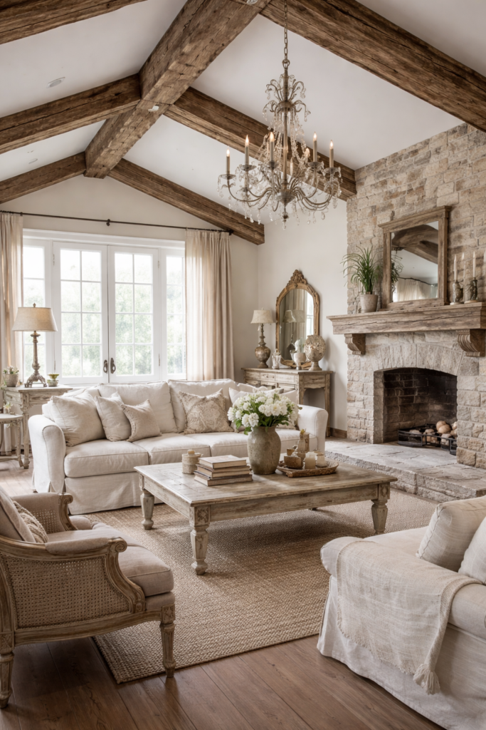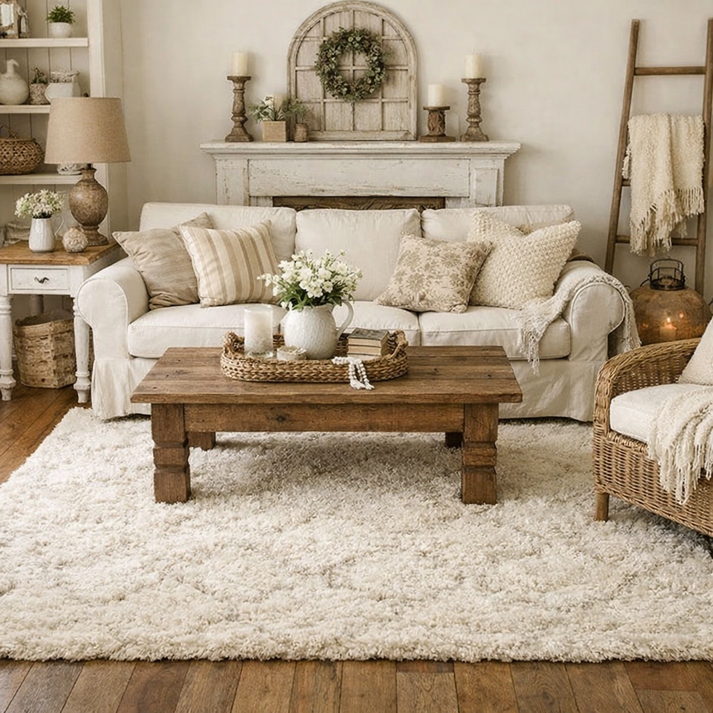 Rugs define the warmth of a space. A shabby chic farmhouse rug or rustic French country living room rug adds softness underfoot while grounding the décor. For neutral lovers, a cream farmhouse living room rug layered over wooden floors feels especially inviting.
