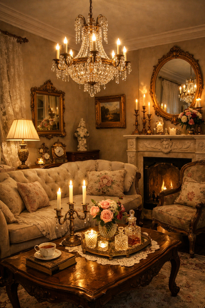 Lighting transforms mood. Chandeliers, table lamps with fabric shades, and candlelight enhance a romantic vintage living room. Opt for antique brass or crystal finishes for that unmistakable old fashion home decor feel.