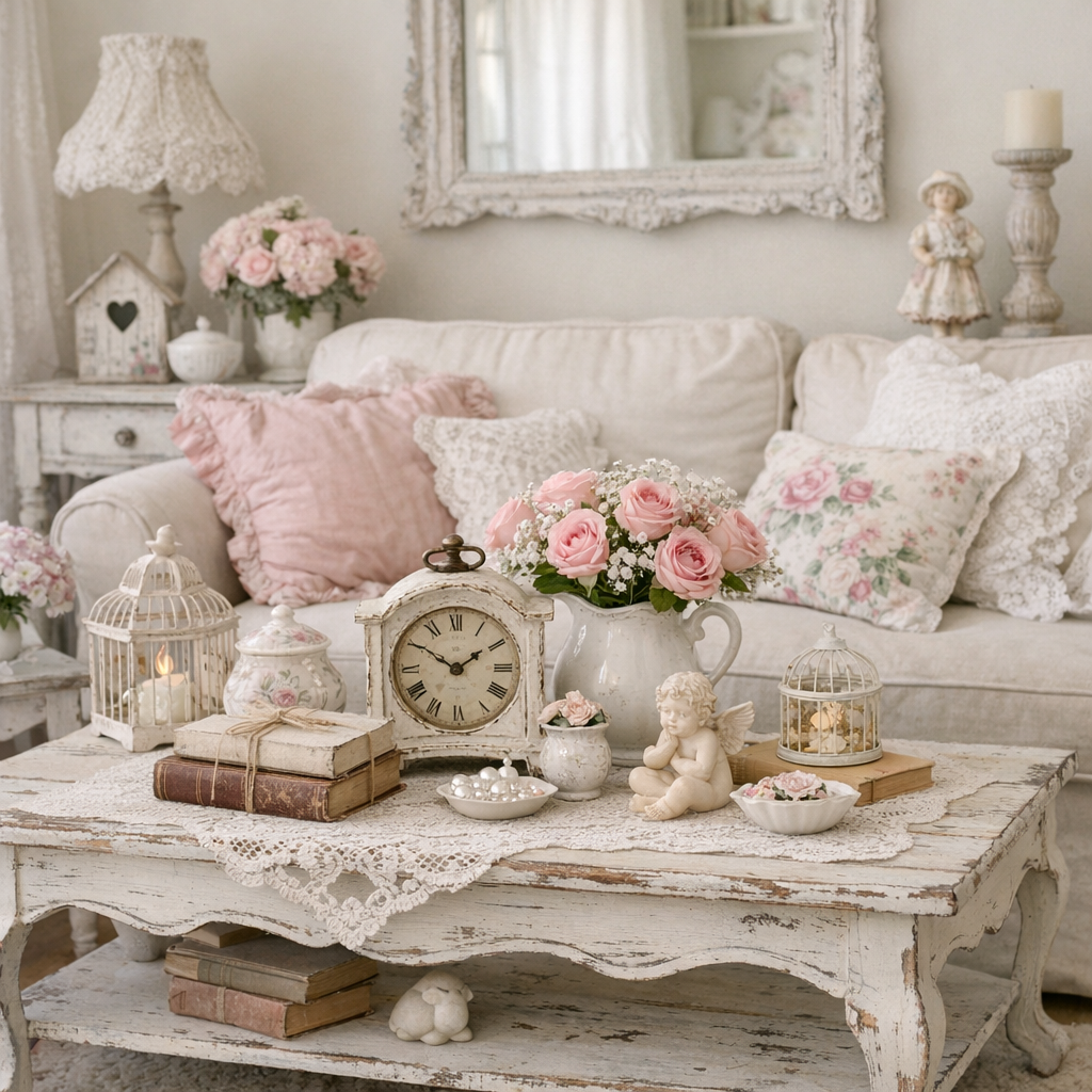 Accessories bring everything together. A distressed shabby chic coffee table, ceramic vases, lace runners, and books add personality. Small cute house decorations—like vintage clocks or porcelain figurines—complete the scene.