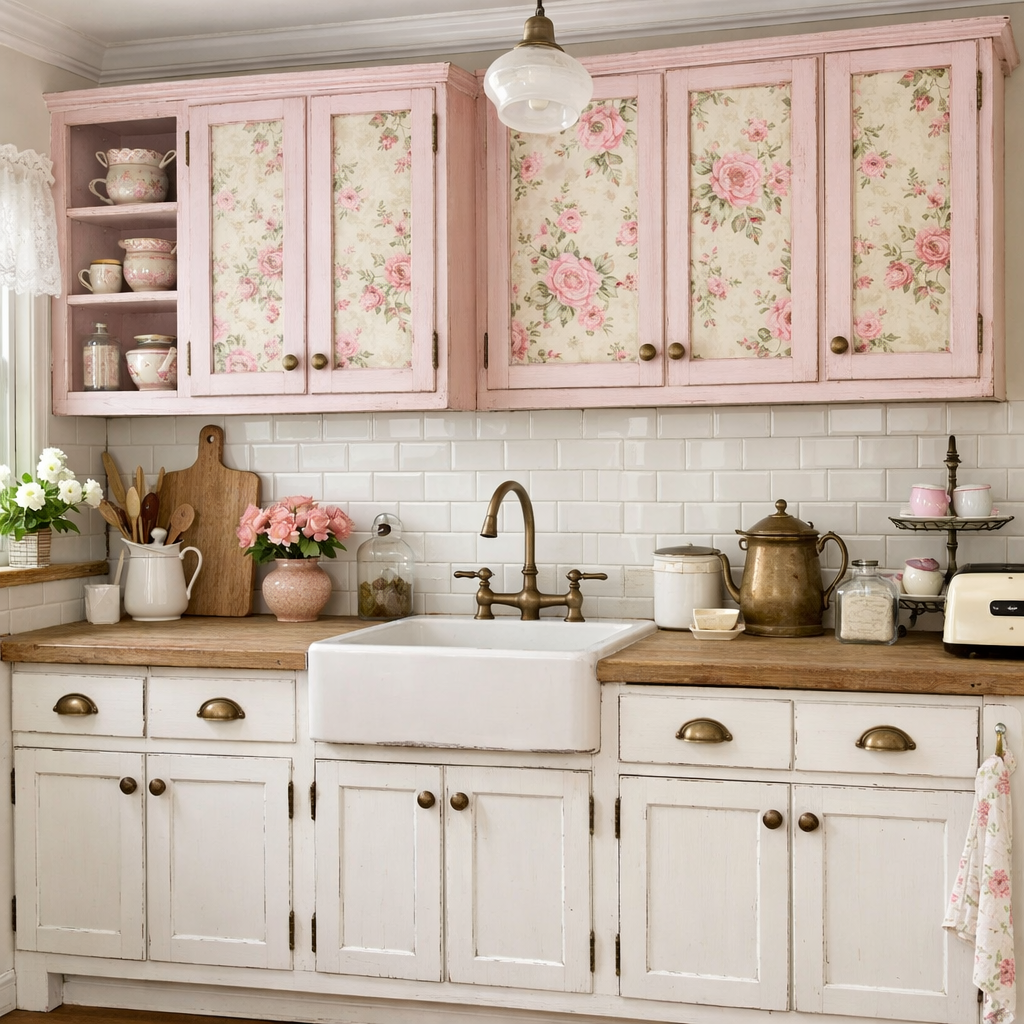 You don’t need a full renovation to get that vintage charm. White Bottom Cabinets with pastel or floral upper cabinets instantly evoke a Chic Cottage feel. A Pink Cabinets Kitchen paired with antique brass hardware can lean into a Pink Kitchen Aesthetic Vintage style without overwhelming the space.