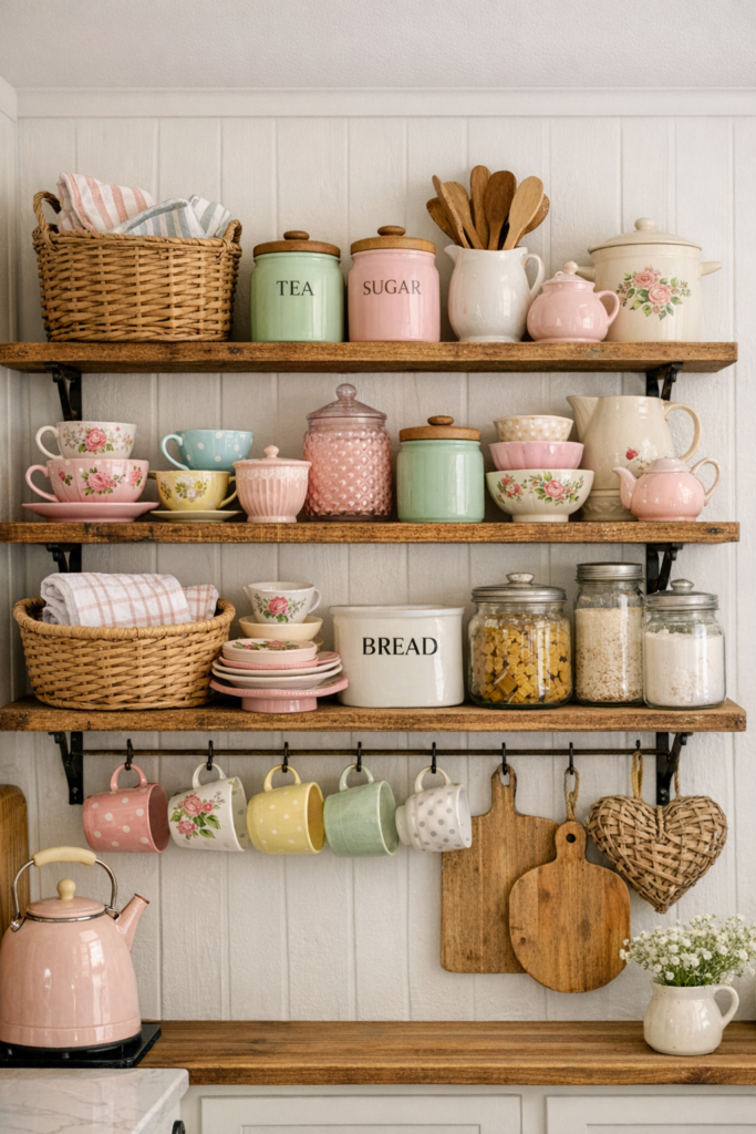 For extra charm, try Kitchen Dishes Storage Ideas that feel decorative—woven baskets, pastel jars, or thrifted ceramic canisters. This approach blends function with beauty in a Tiny Cottage Kitchen.