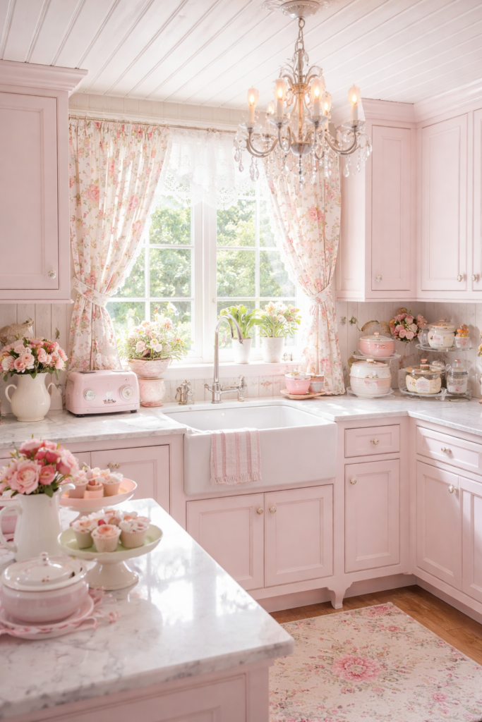 If you love feminine spaces, a Pink Shabby Chic Kitchen Cottage Style is pure magic. Soft blush walls, floral curtains, and pastel ceramics create a Romantic Kitchen Aesthetic that feels gentle and nostalgic.