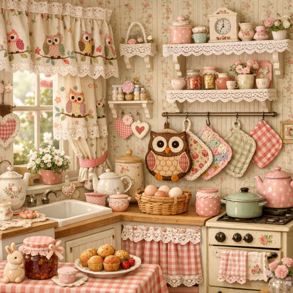 Small details are what make a kitchen feel like home. Add Owl Fabric accents, lace trims, or handmade potholders for a Grandma Core House feel. These touches shine in a Cute Cottage Interior or Farm Cottage House Interior, where personality matters more than perfection.