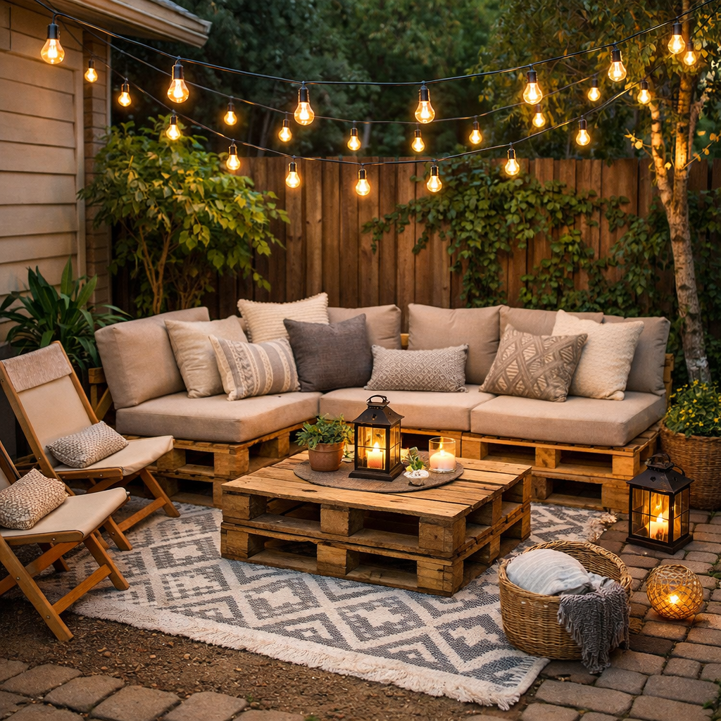 Start with simple furniture like foldable chairs, wooden benches, or pallet seating. Add cushions, outdoor rugs, and soft lighting to make the space inviting.