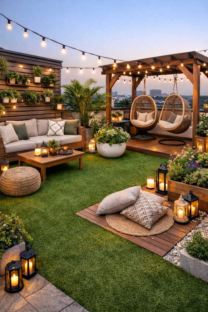 A tarace garden can include plants, seating, and decorative lighting for a relaxing atmosphere.