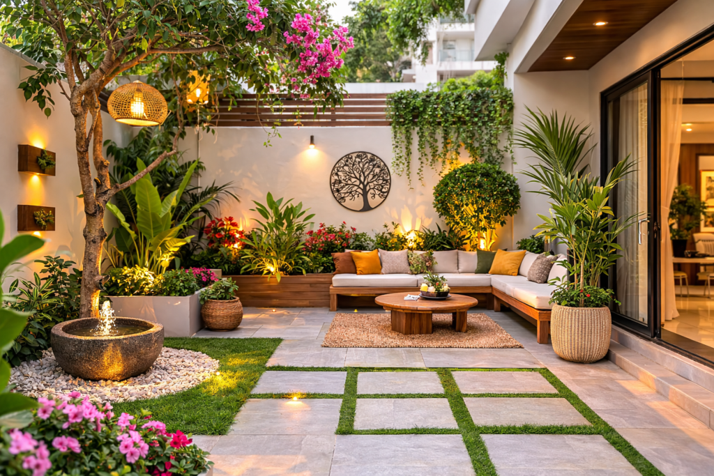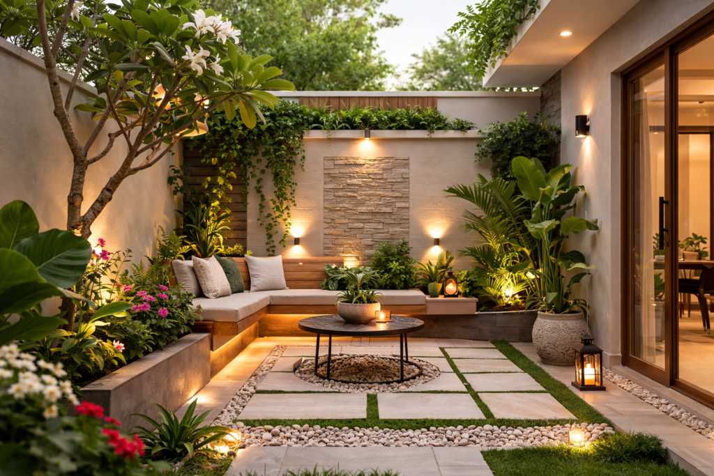 This works especially well for garden ideas sitting area, courtyard landscape, or small outdoor patios where space is limited.
