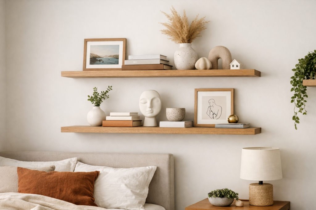 Floating shelves remain one of the smartest small wall decor ideas because they add storage and style simultaneously.