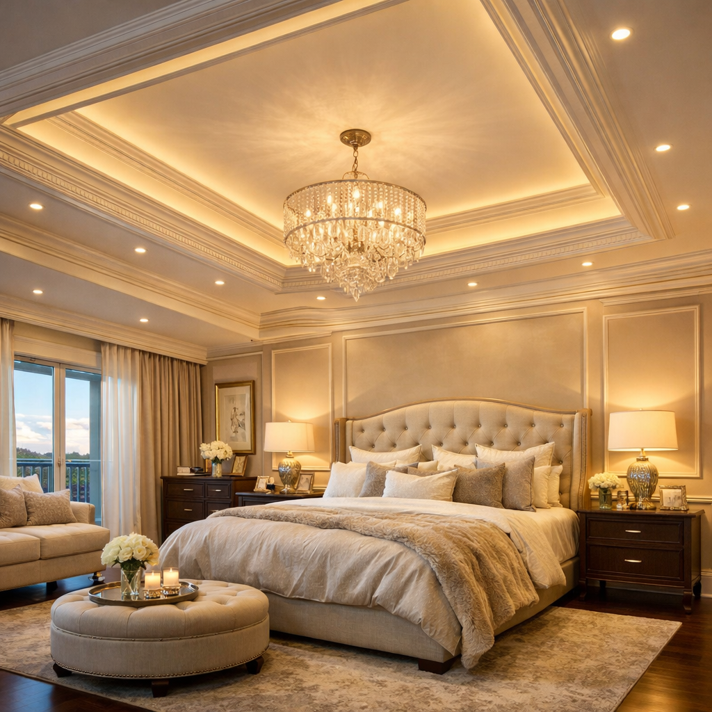 Designing a luxurious master suite starts from the top—literally. A tray ceiling with lighting ideas for master bedroom can completely transform your space into a sophisticated retreat. From modern tray ceiling lighting master bedroom concepts to classic crown molding details, the right ceiling design creates depth, ambiance, and visual drama.