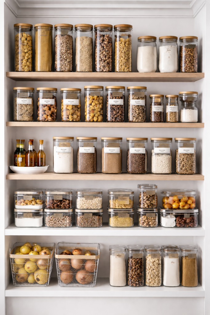 If your kitchen has modern cabinetry, stick to sleek storage containers. If you love farmhouse décor, use rustic bins and wood tones. This creates a consistent Pantry Style and supports an overall Organized Home Aesthetic.