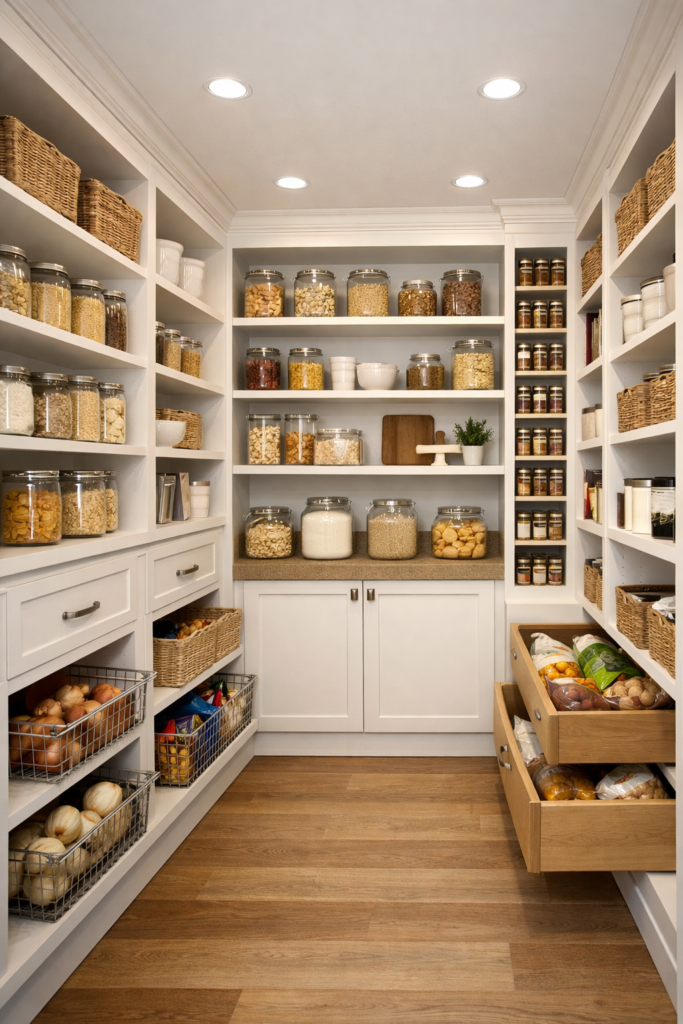 If your pantry is narrow, consider shelving on one side with pull-out drawers. This works great for Pantry Small Walk In spaces and supports Pantry Room Ideas Walk In Storage goals.