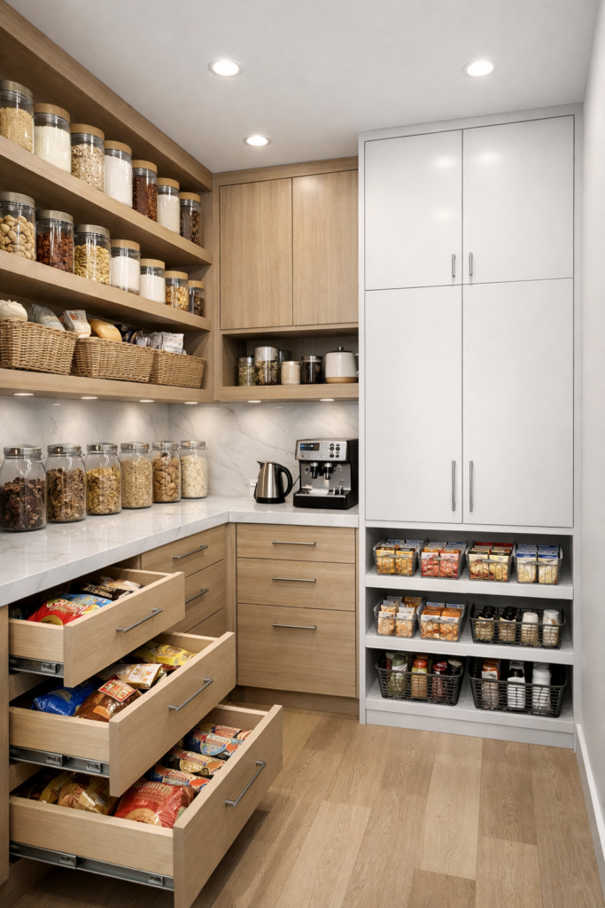 Luxury pantries look balanced. Too much open shelving can feel cluttered, while too many closed cabinets can feel heavy.