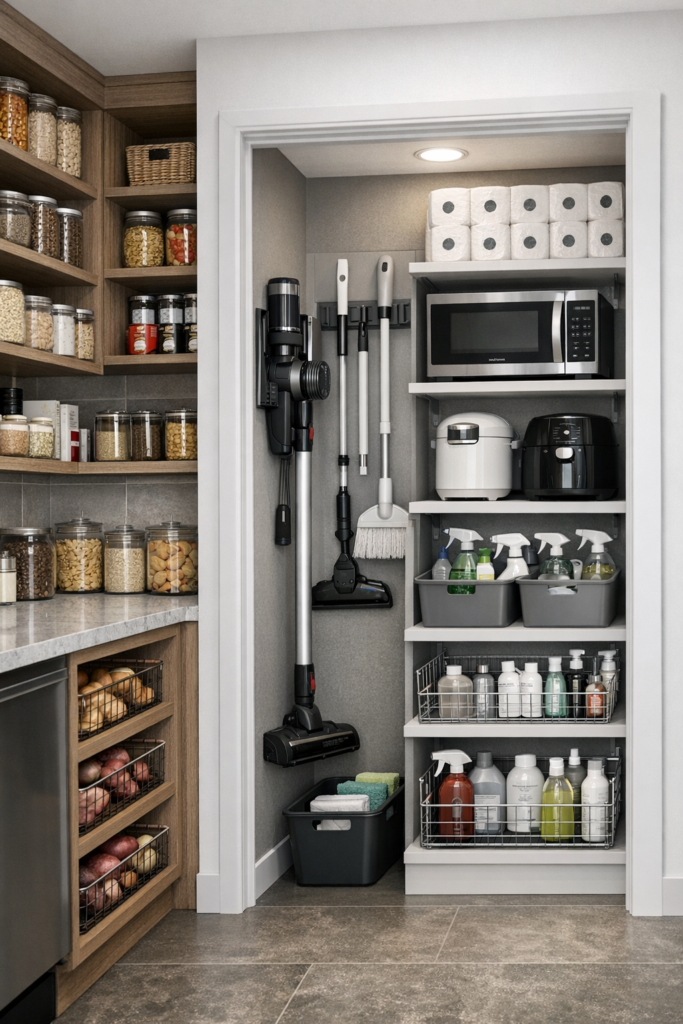 Many people want a pantry that does more than store food. Adding a mini utility corner is a game-changer.