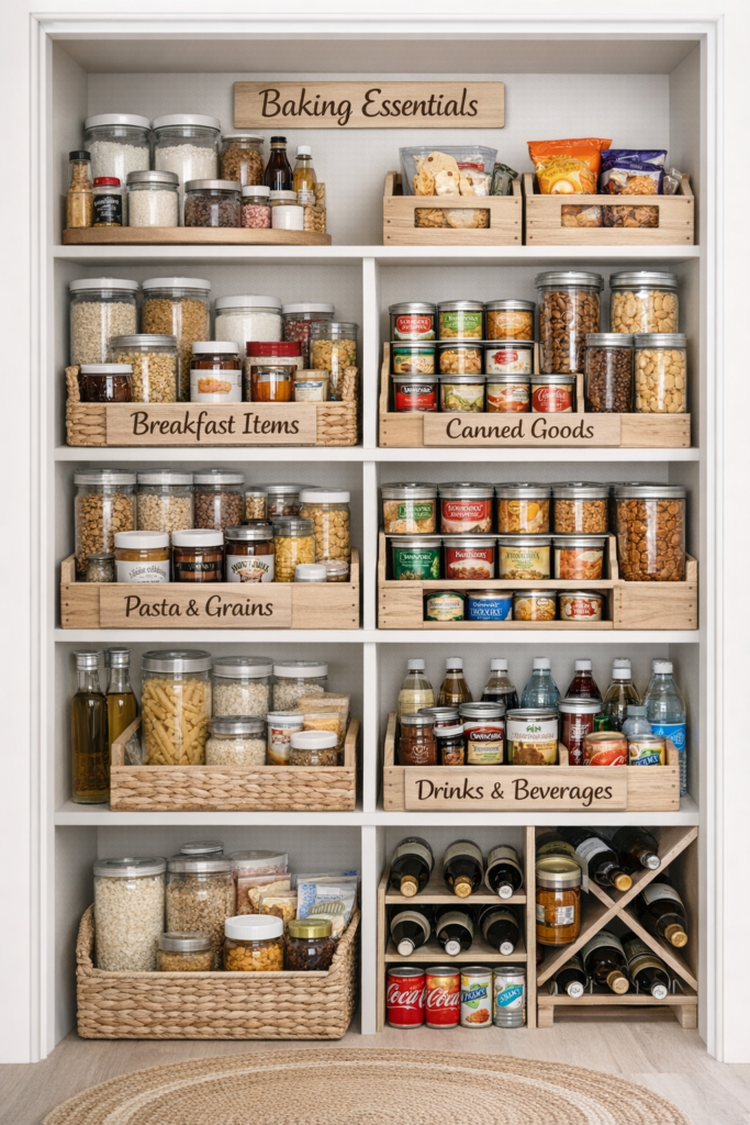 This is one of the simplest Pantry Idea tricks, yet it delivers the biggest impact. Zoning makes your pantry look clean, organized, and effortless—an essential part of the House Organization Aesthetic.